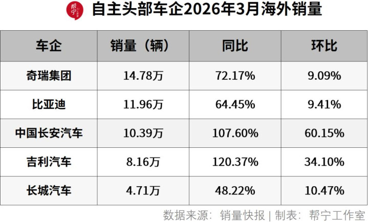 同时,中国长安汽车海外3月销量首次突破10万辆(实为10.39万辆),同比增长107.60%,环比增长60.15%,创历史新高。