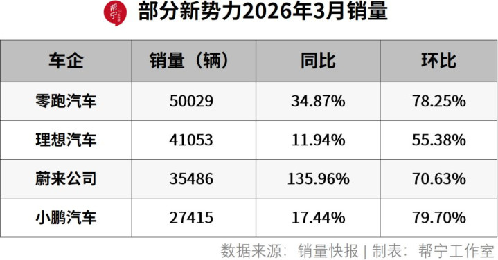 3月,蔚来、理想、零跑等新势力交付量集体大涨。小米汽车虽增速承压,但仍保持稳定输出,鸿蒙智行“五界”也依托产品体系,整体维持着市场份额。这些造车新势力在中高端新能源市场的优势持续扩大。
