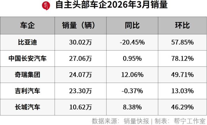 截至发稿,有5家自主品牌车企——比亚迪、中国长安汽车、奇瑞汽车、吉利汽车和长城汽车——发布了3月销量。凭借各自的产品布局与发展策略,5家都交出了不同的销量答卷,既有增长亮点,也体现了各自的挑战。