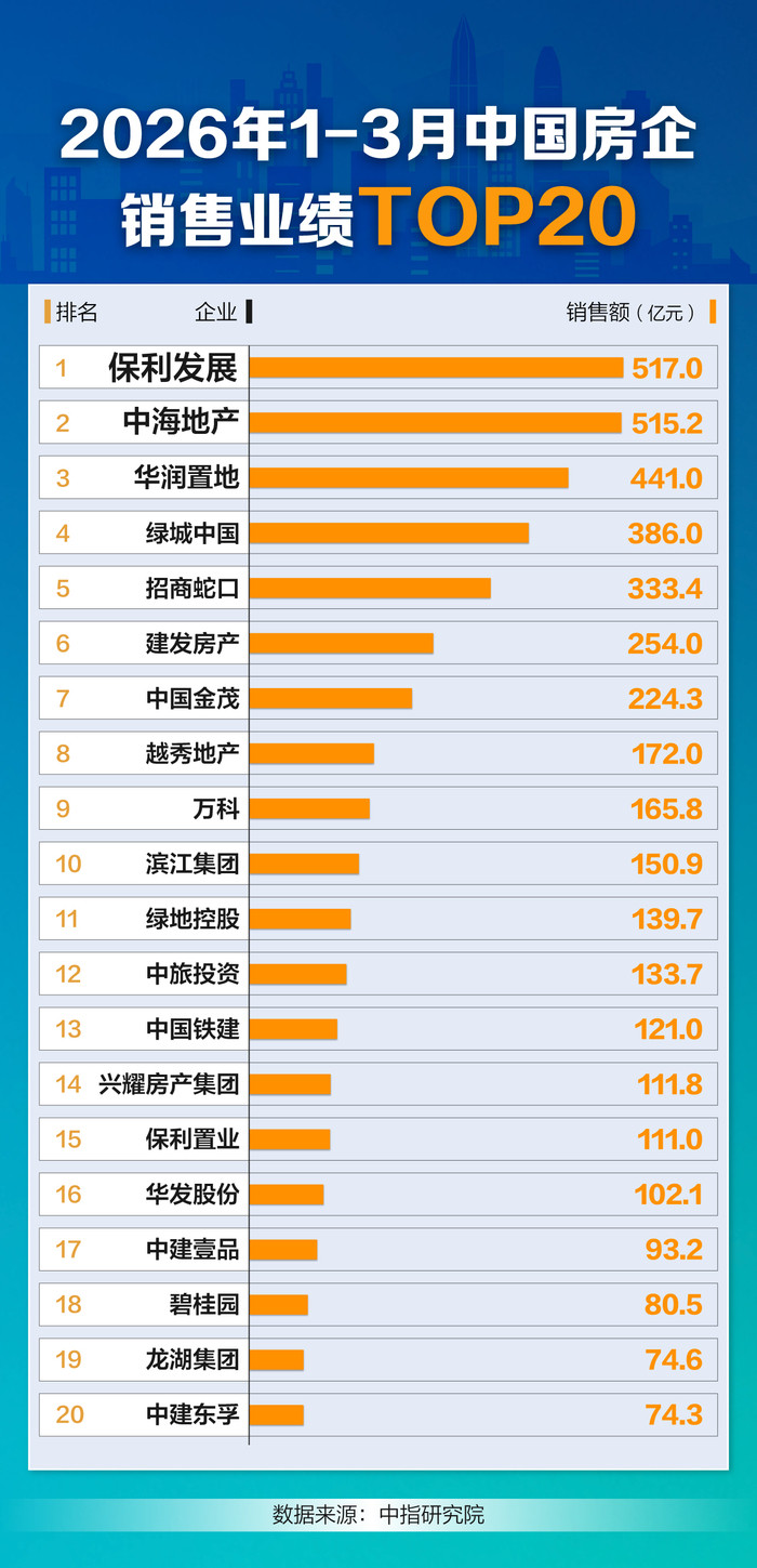 据中指研究院、亿翰智库等最新数据,今年一季度,保利全口径销售额为517亿元,位居百强房企首位;中海、华润全口径销售额分别为515亿元和441亿元。从TOP10的变化来看,位居第四名和第五名的为绿城中国和招商蛇口,全口径销售额分别为386.0亿元和333.4亿元。同时,建发、金茂、越秀、万科、滨江也位居前10名。